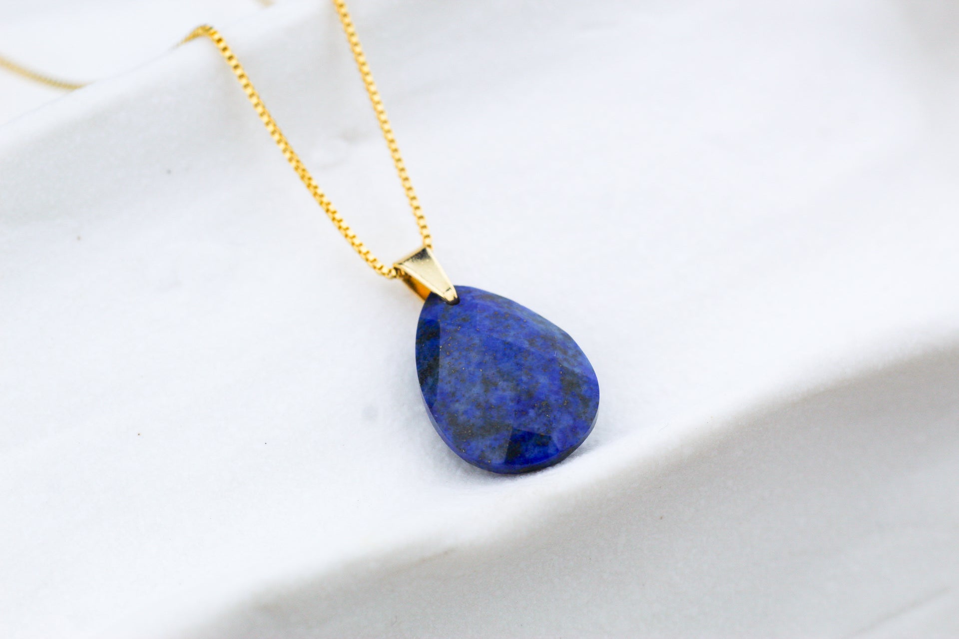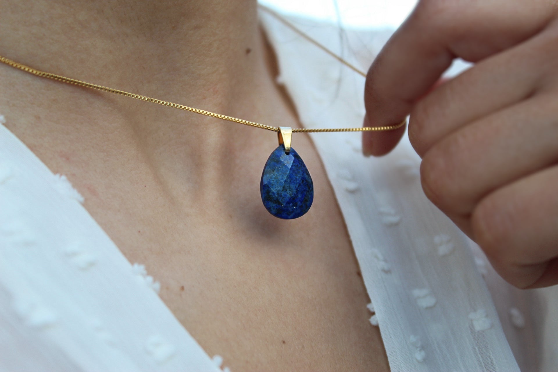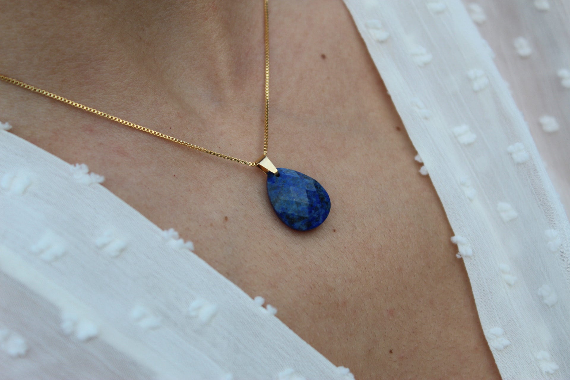 El collar Lapislázuli Drops Facet 1,8 cm. de ANANDA GALEA®️ ha sido diseñado pensando en tu bienestar y estilo. Gracias a que es libre de níquel y plomo, cuidará tu piel. Fabricado con materiales nobles y de calidad superior, esta joya está enchapada en oro de 18 quilates.