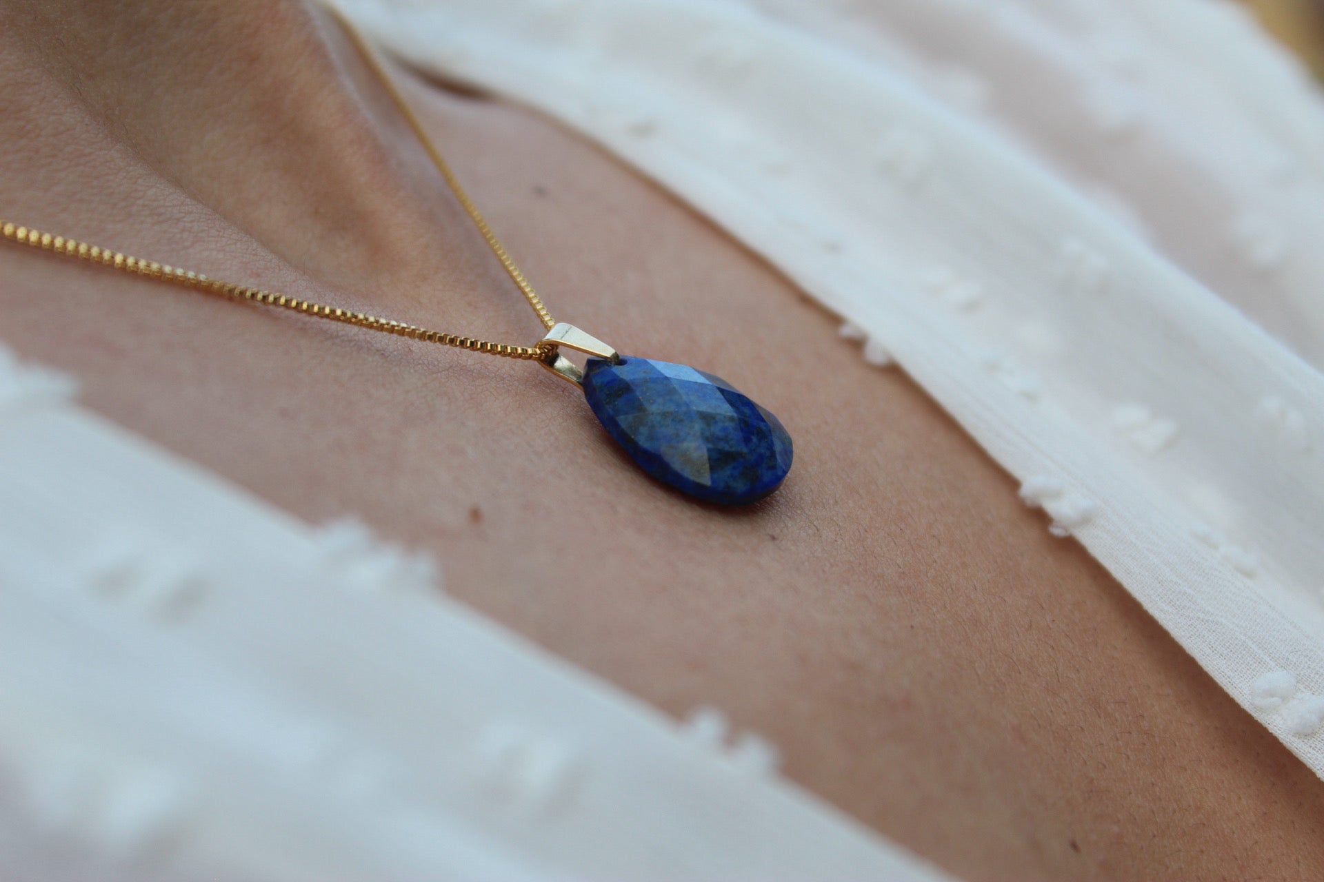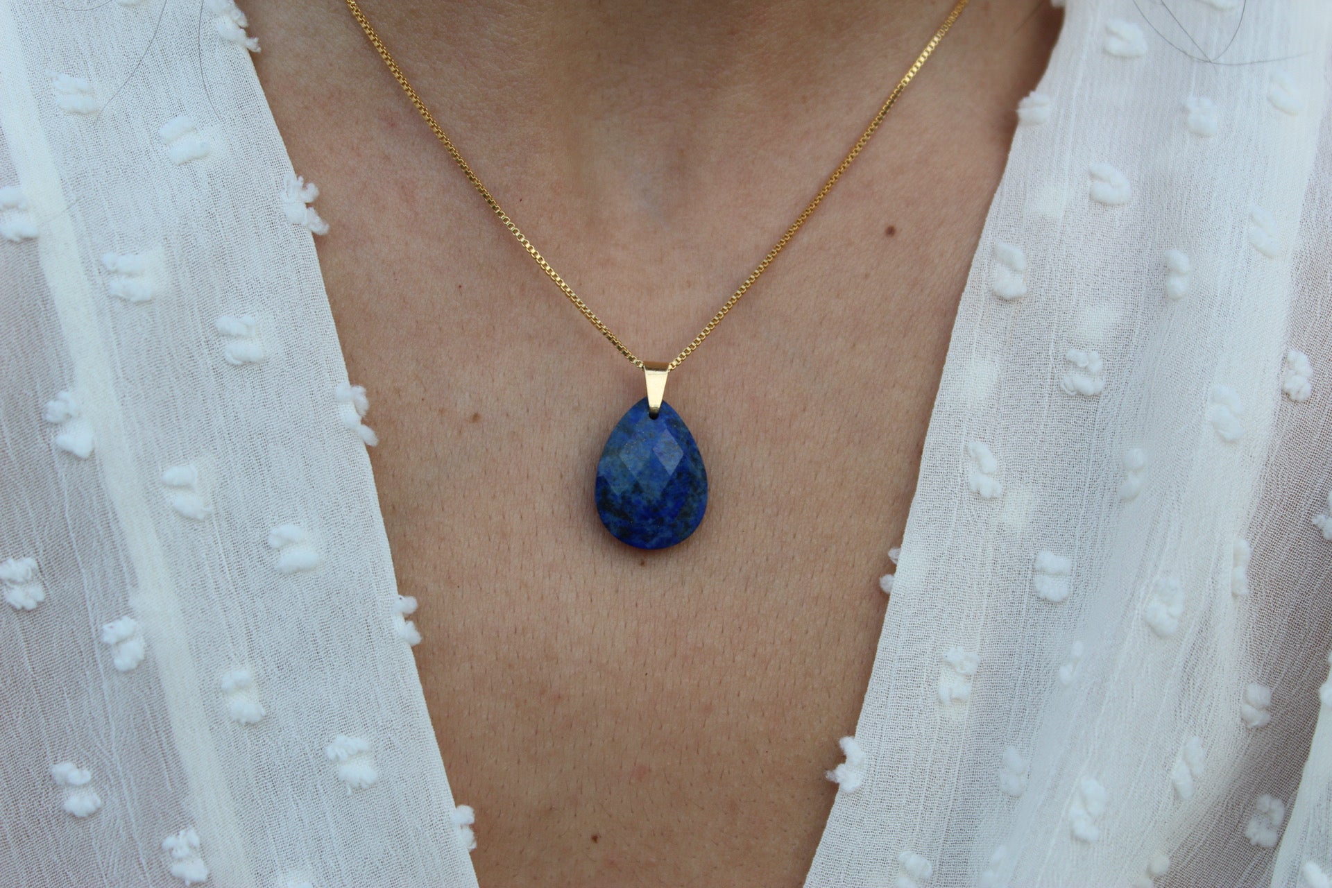 Collar Lapislázuli Drops Facet 1,8 cm., elegancia con raíz chilena.
