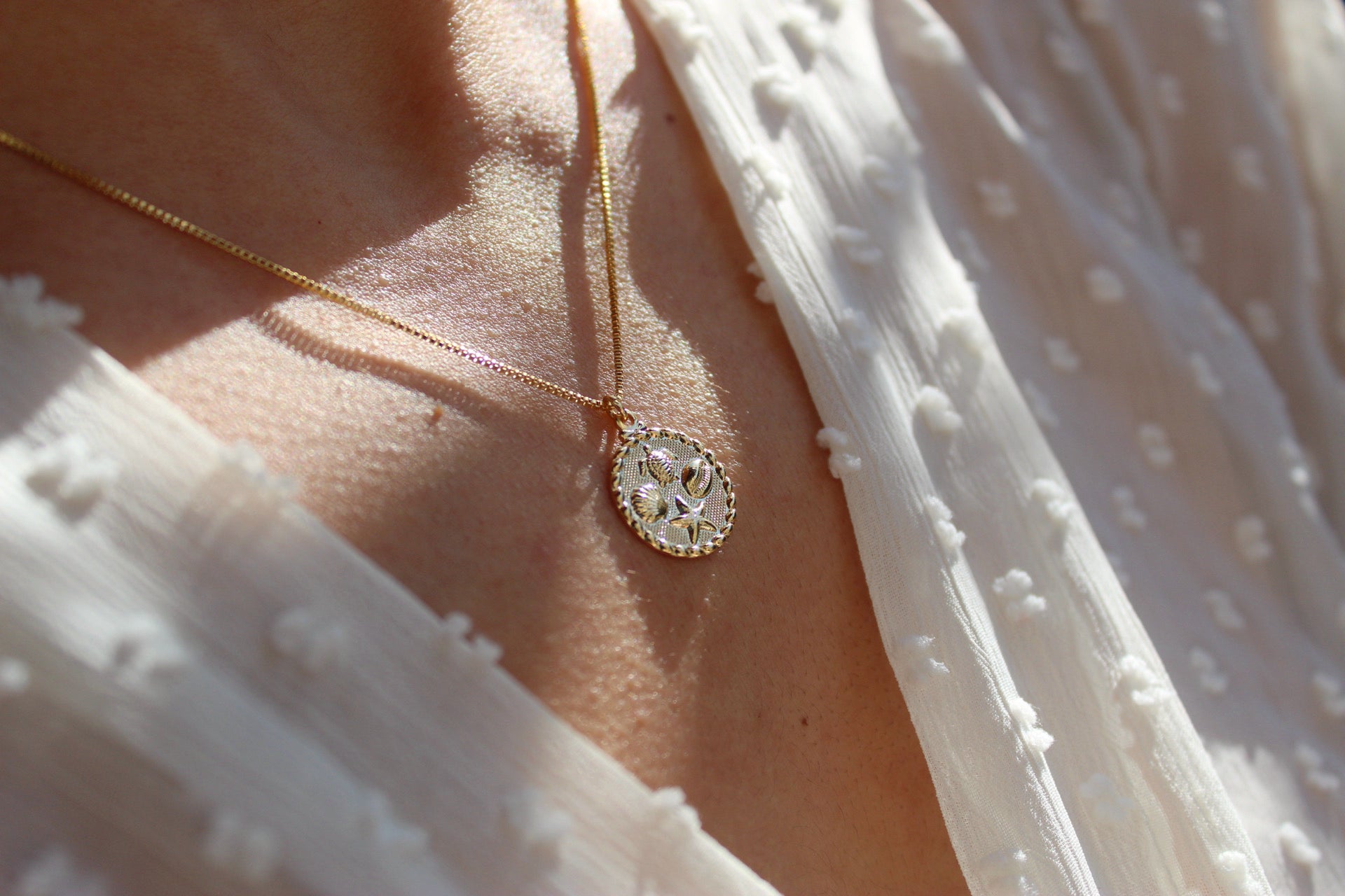 Dentro de esta medalla se esconden pequeños tesoros del mar: una tortuga y amuletos marinos que evocan calma, libertad y armonía. 🌊