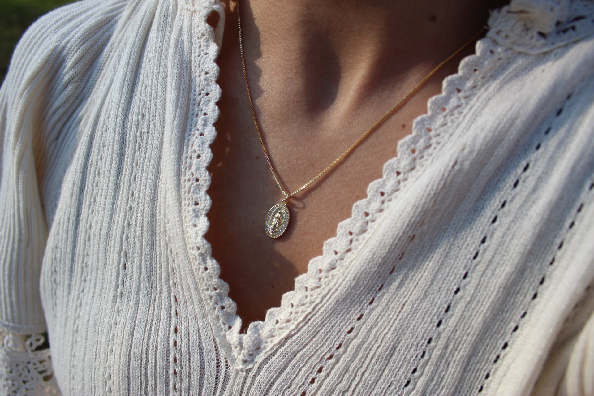 El collar Virgen Frost lado de ANANDA GALEA®️ ha sido diseñado pensando en tu bienestar y estilo. Gracias a que es libre de níquel y plomo, cuidará tu piel. Fabricado con materiales nobles y de calidad superior, esta joya está enchapada en oro de 18 quilates.