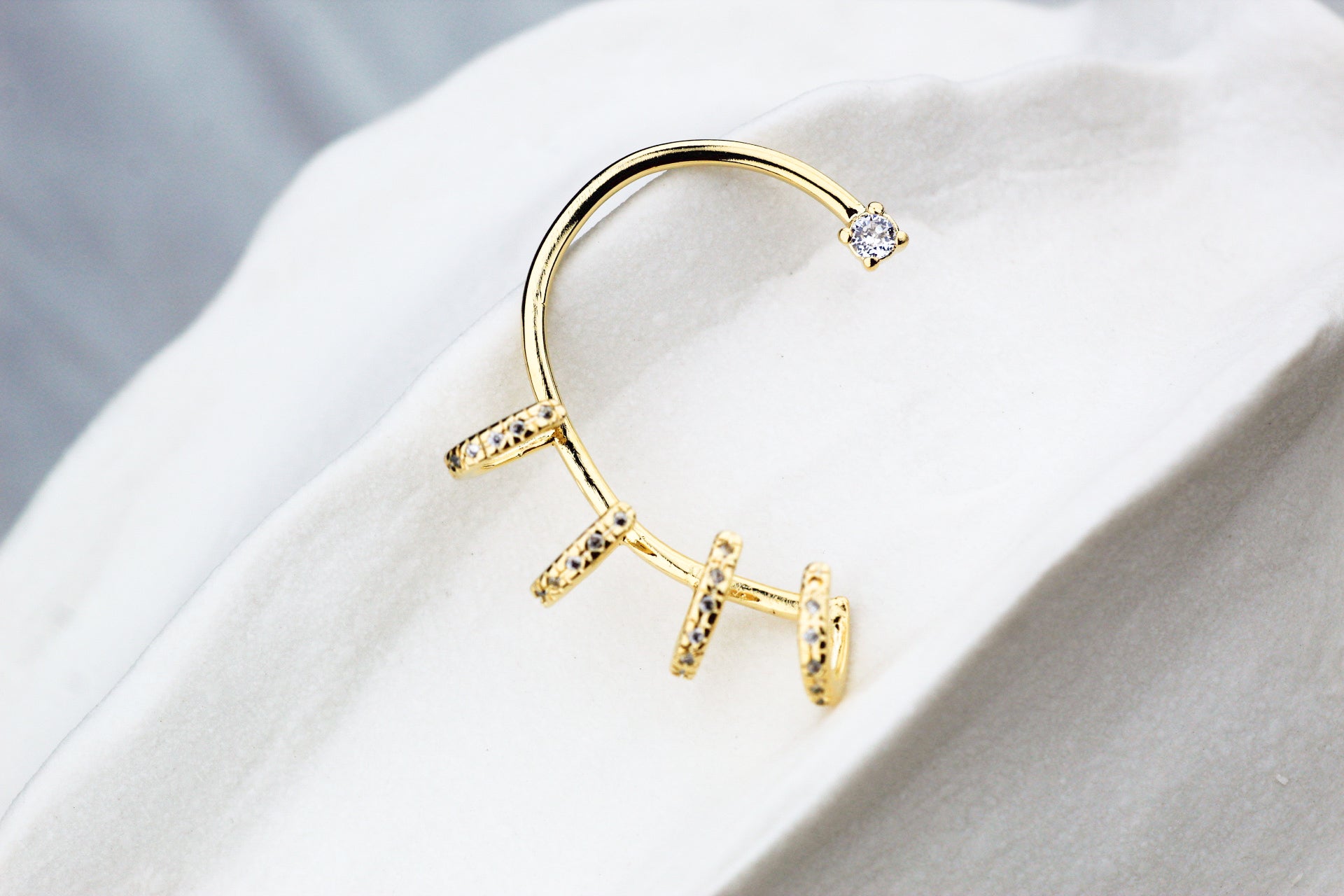Su diseño rodea la oreja con curvas y reflejos que crean un efecto de varias argollas ascendentes, finalizando con un punto de luz que atrae todas las miradas. 💫